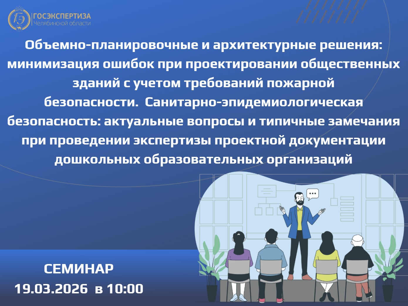 19.03.2026, Челябинск. ОГАУ «Госэкспертиза Челябинской области» приглашает проектировщиков, архитекторов и специалистов строительной отрасли принять участие в очном семинаре «Объемно-планировочные и архитектурные решения: минимизация ошибок при проектировании общественных зданий с учетом требований пожарной безопасности. Санитарно-эпидемиологическая безопасность: актуальные вопросы и типичные замечания при проведении экспертизы проектной документации дошкольных образовательных организаций».